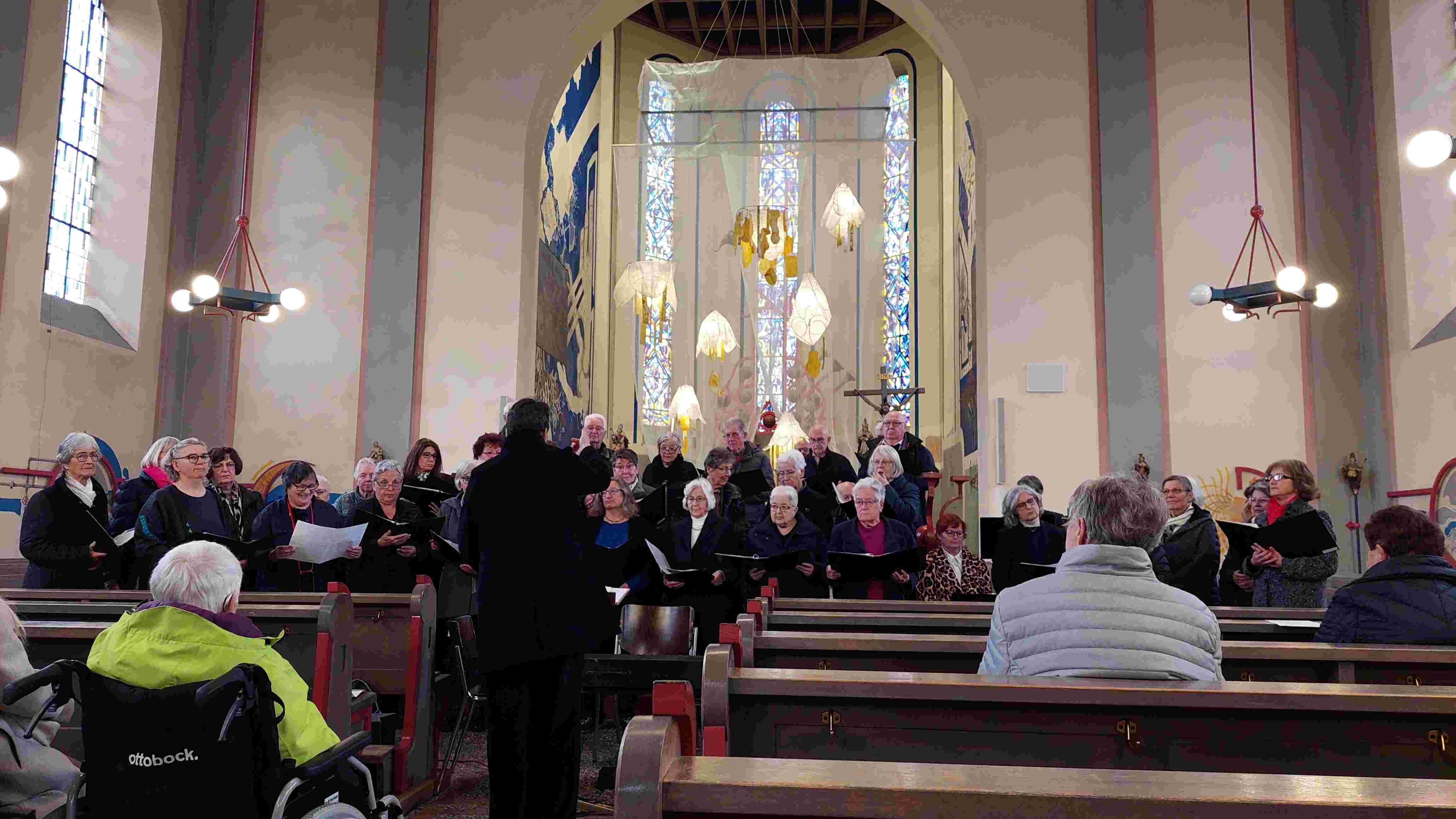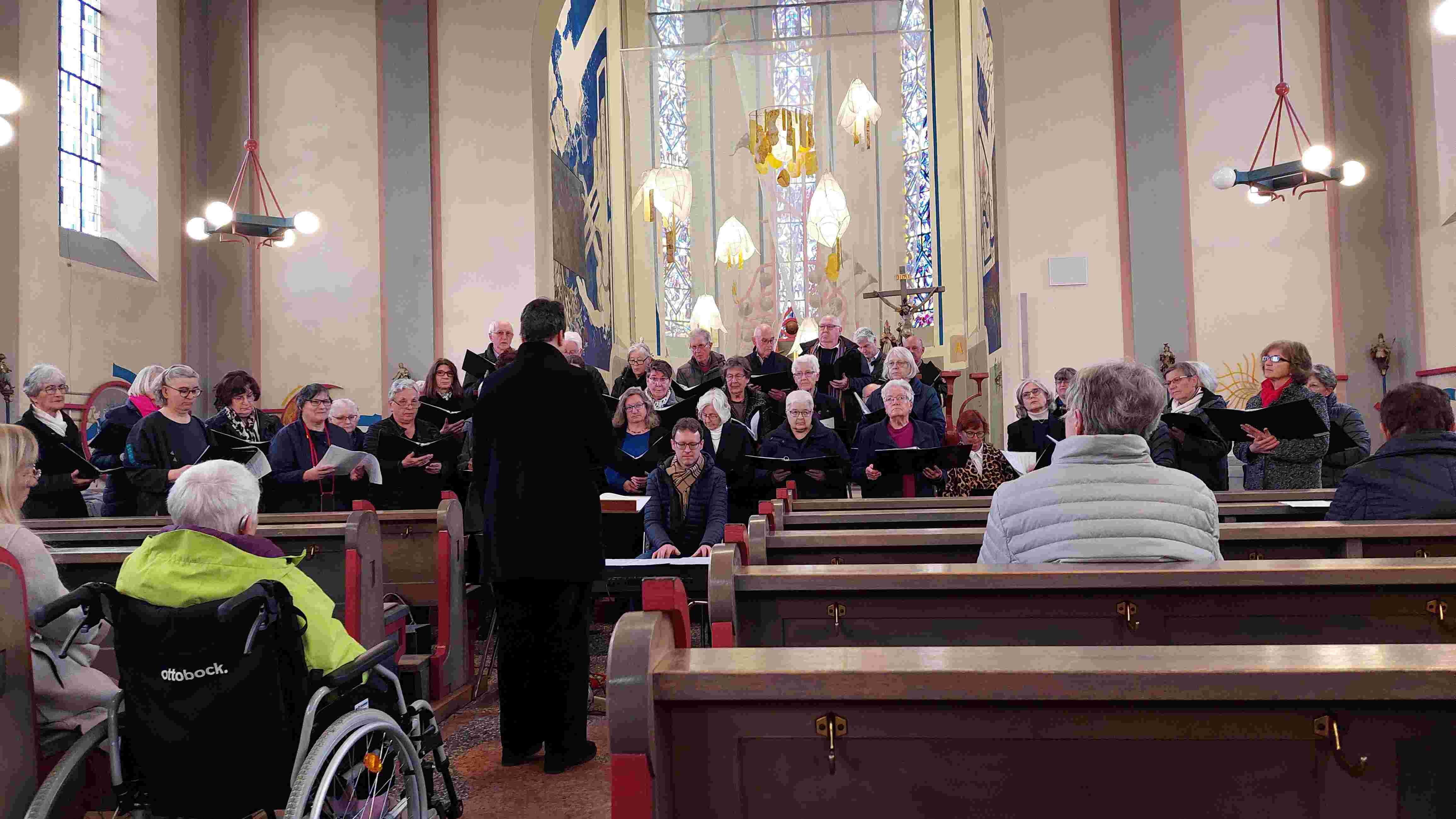 Der Liederkranz und der evang. Kirchenchor unter der Leitung von Frau Sauter-Pfrom, begleitet von Herrn Brugger, hat die Fastenpredigt von Pfarrerin Kleinknecht-Wagner mit dem Thema "Frieden tun! Was bedeutet Frieden für mich selbst und im Miteinander der Menschen" musikalisch begleitet.